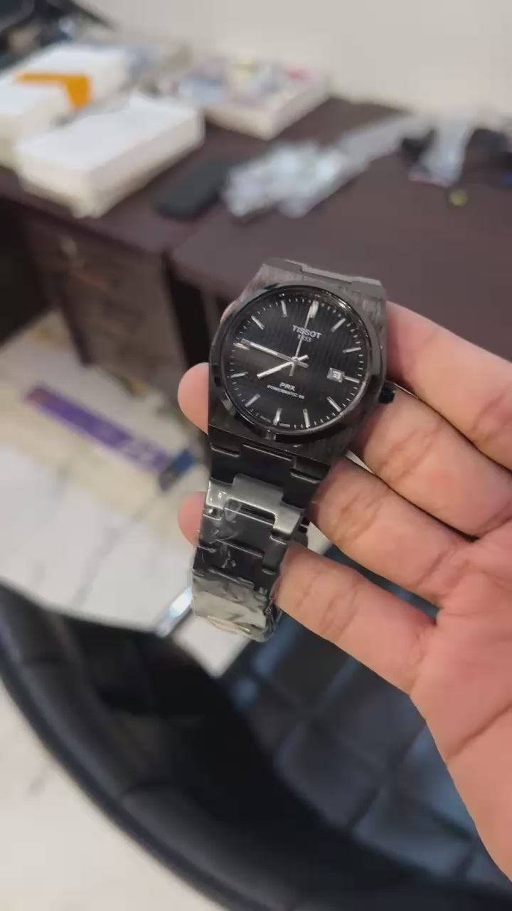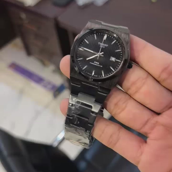 The watch is a sleek, all-black Tissot PRX with a brushed finish that gives it a modern, stealthy look. It features a round dial with a vertically striped texture and slim, baton-style hour markers that catch the light subtly. The hands are simple and crisp, with a slim seconds hand. A small date window sits at the 3 o’clock position, framed neatly. The case and integrated bracelet are black, with a brushed surface on both the case and links, giving the watch a cohesive, monochrome aesthetic. The overall profile is compact and sporty yet refined, suitable for both casual and dressier occasions.